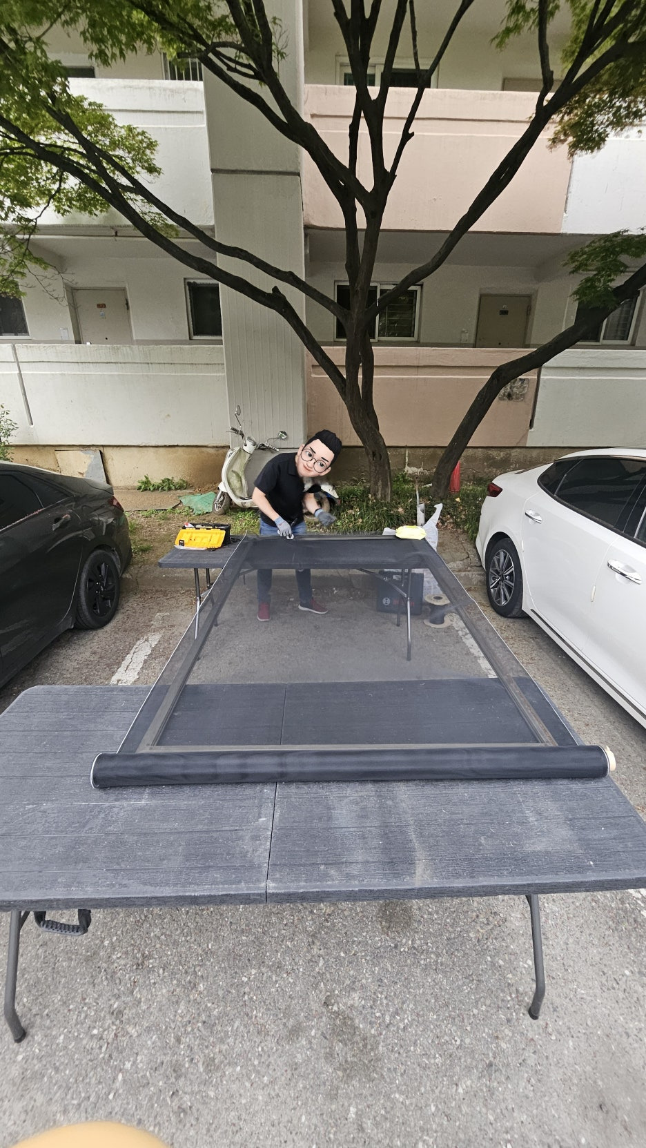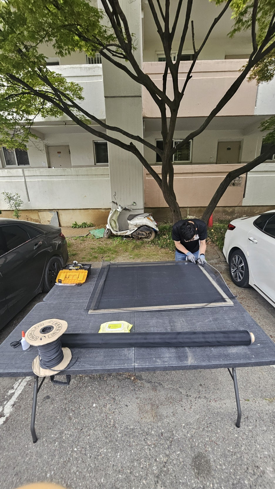 따뜻한 봄 햇살 아래, 아파트 단지 내 나무 그늘 아래서 조립작업을 했습니다.