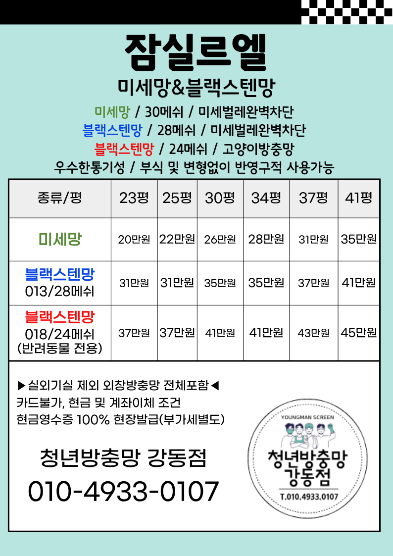 청년방충망강동점에서는 잠실르엘 입주민고객님을 대상으로 미세발수방충망 & 블랙스텐미세방충망 공동구매를 진행합니다.