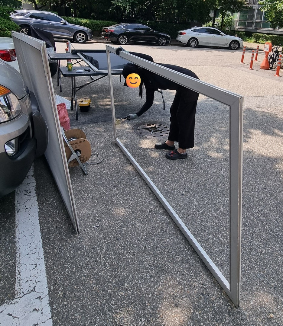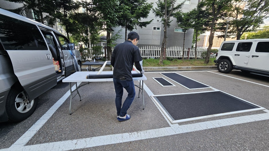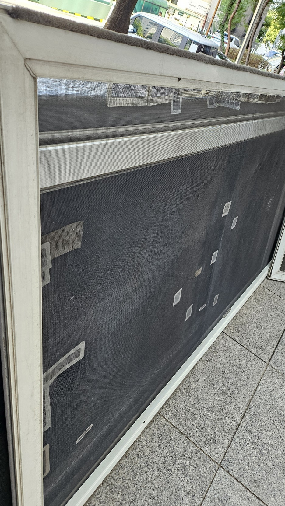 탈거한 방충망을 1층 외부의 작업 공간으로