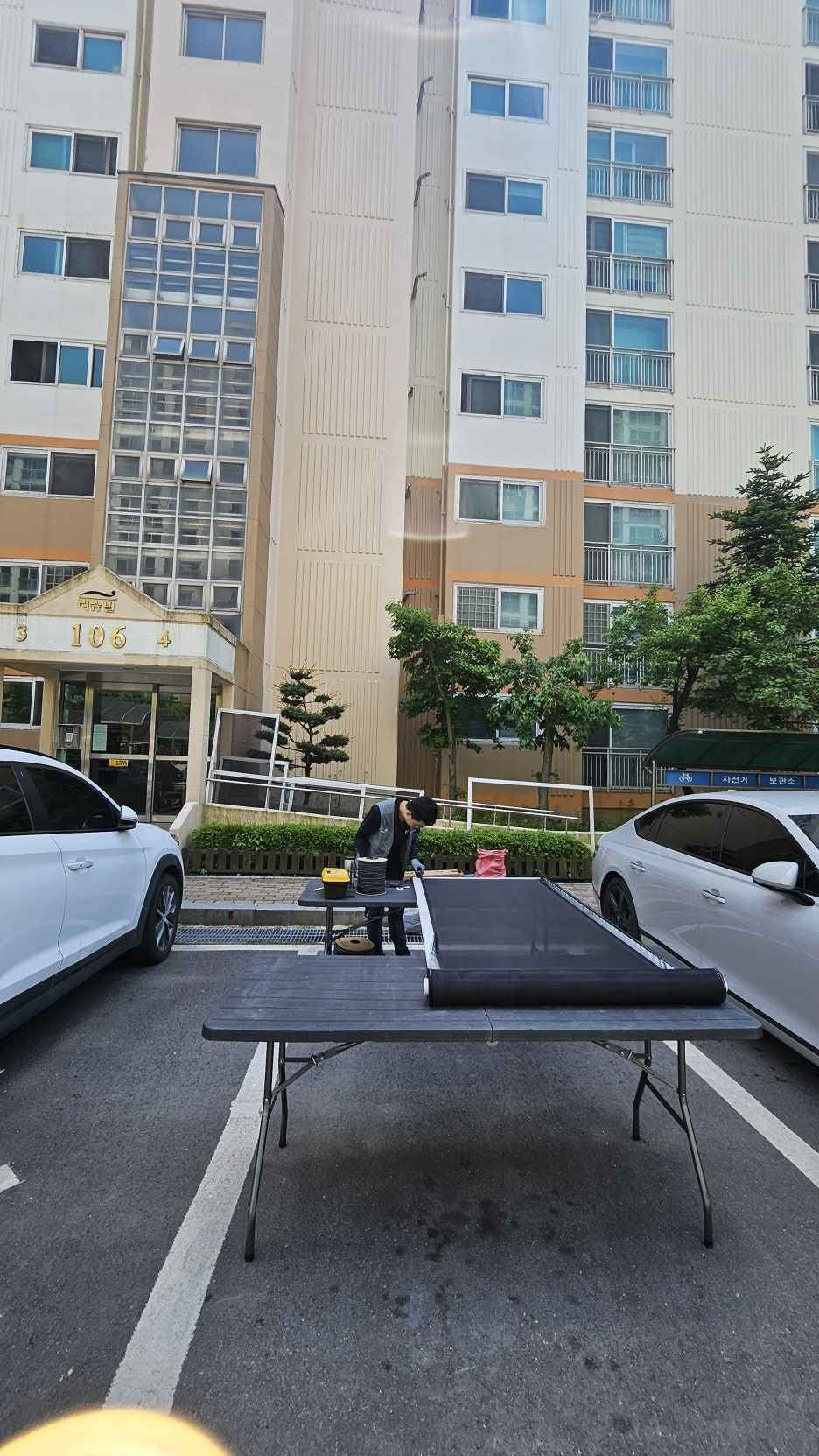 탈거를 마치고 1층 현관 앞에 간이 작업대를 설치해 교체 작업에 들어갔습니다.