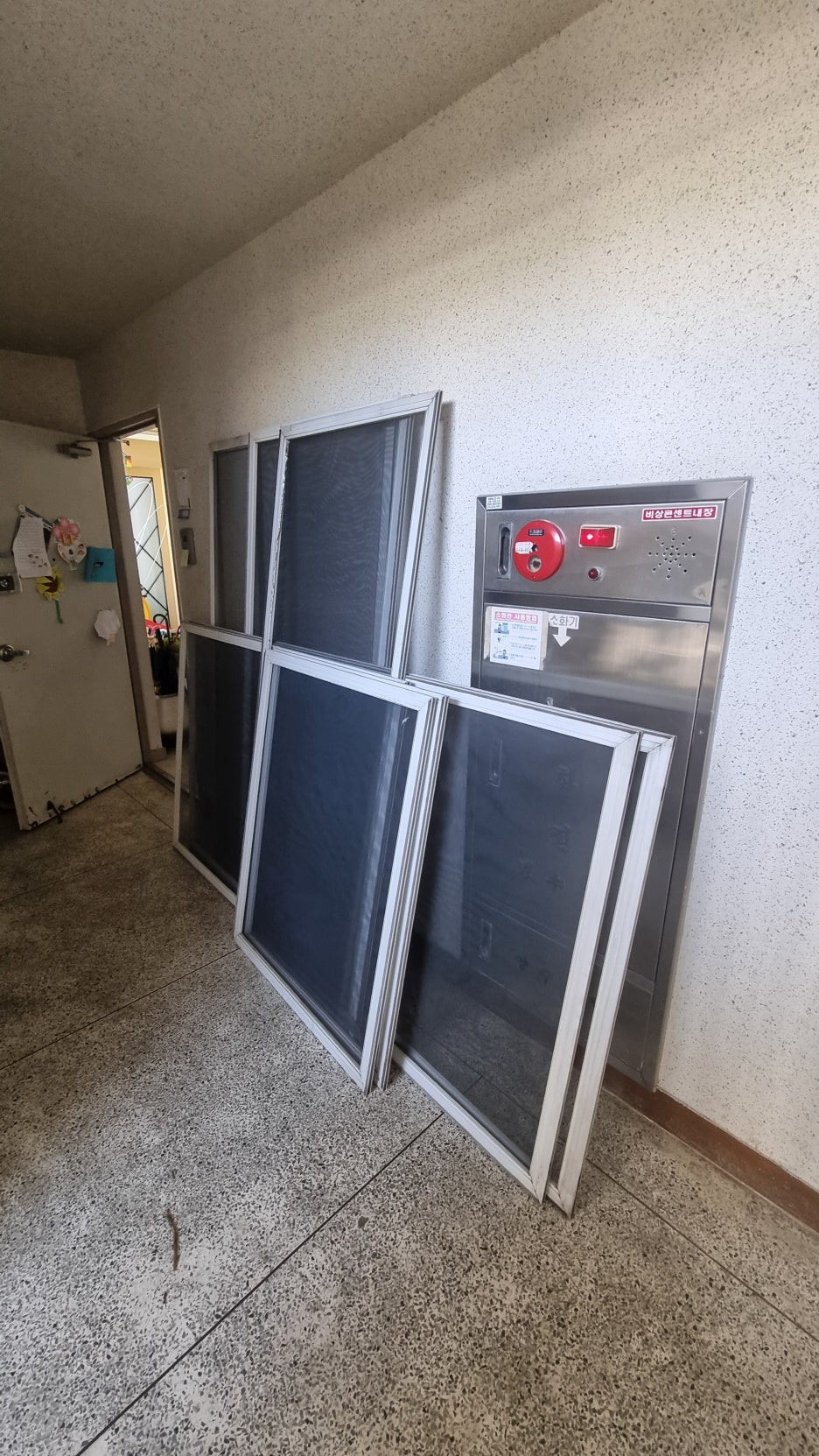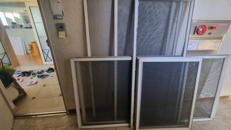 자! 방문하여 먼저 기존의 방충망에 번호를 적은 뒤! 모두 제거하여 복도로 꺼냈습니다!