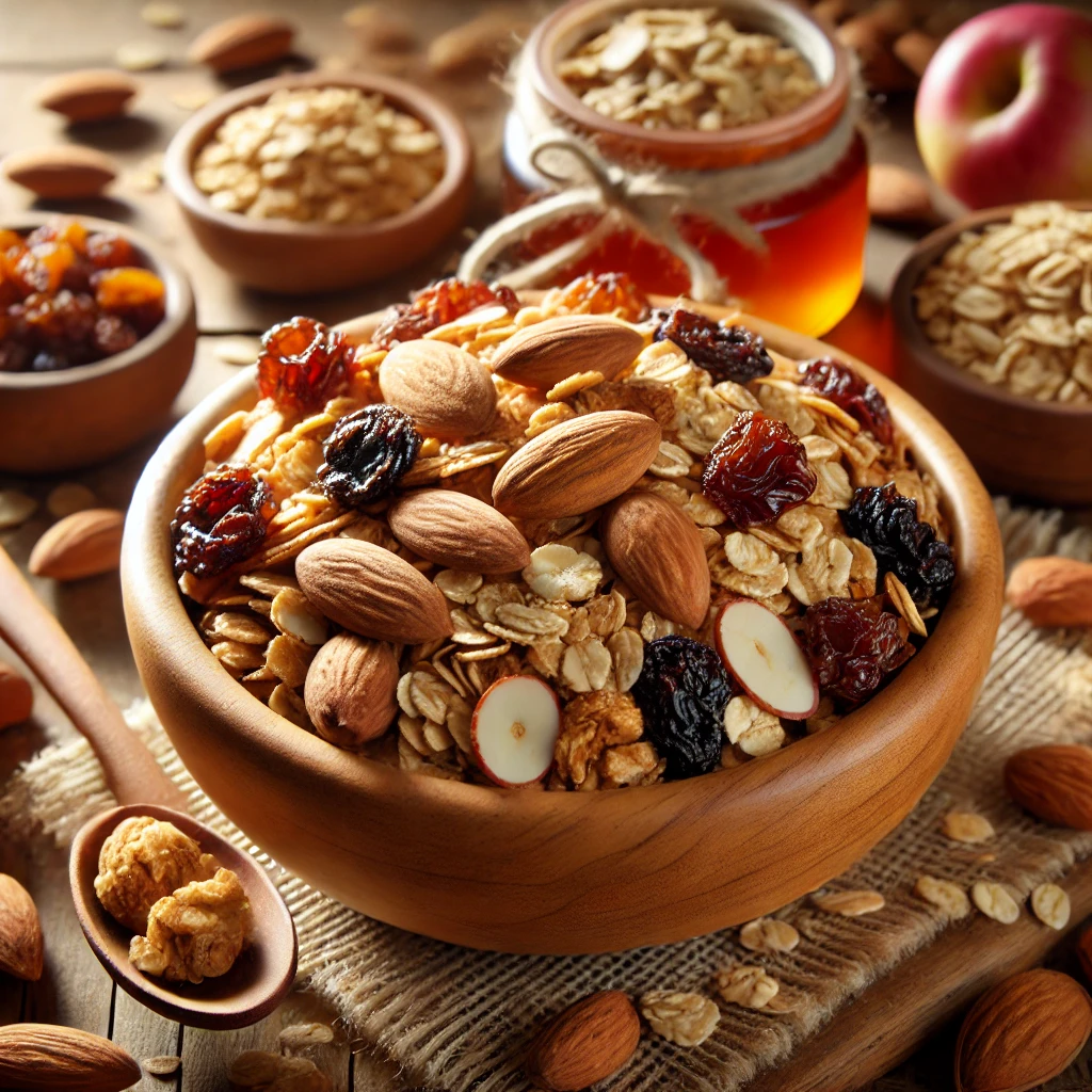 재료: 오트밀, 꿀, 구운 아몬드, 건과일 (건포도, 크랜베리 등)
